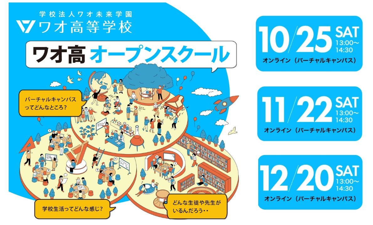 教養探究で哲学・科学・経済を学べる通信制高校・学校法人ワオ未来学園 ワオ高等学校(所在地:岡山県岡山市、校長:平田強)は、10月~12月もオンラインにて「ワオ高オープンスクール」を実施いたします。
