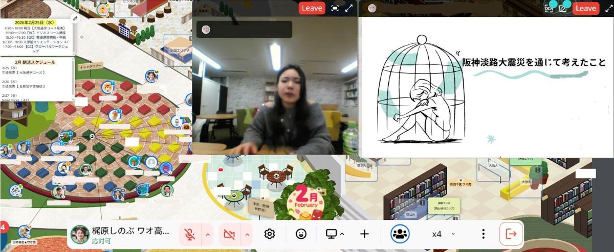 さらに、発表は大阪キャンパスだけにとどまりません。バーチャルキャンパスの朝活の時間にも、全校生徒に向けて発表を行いました。