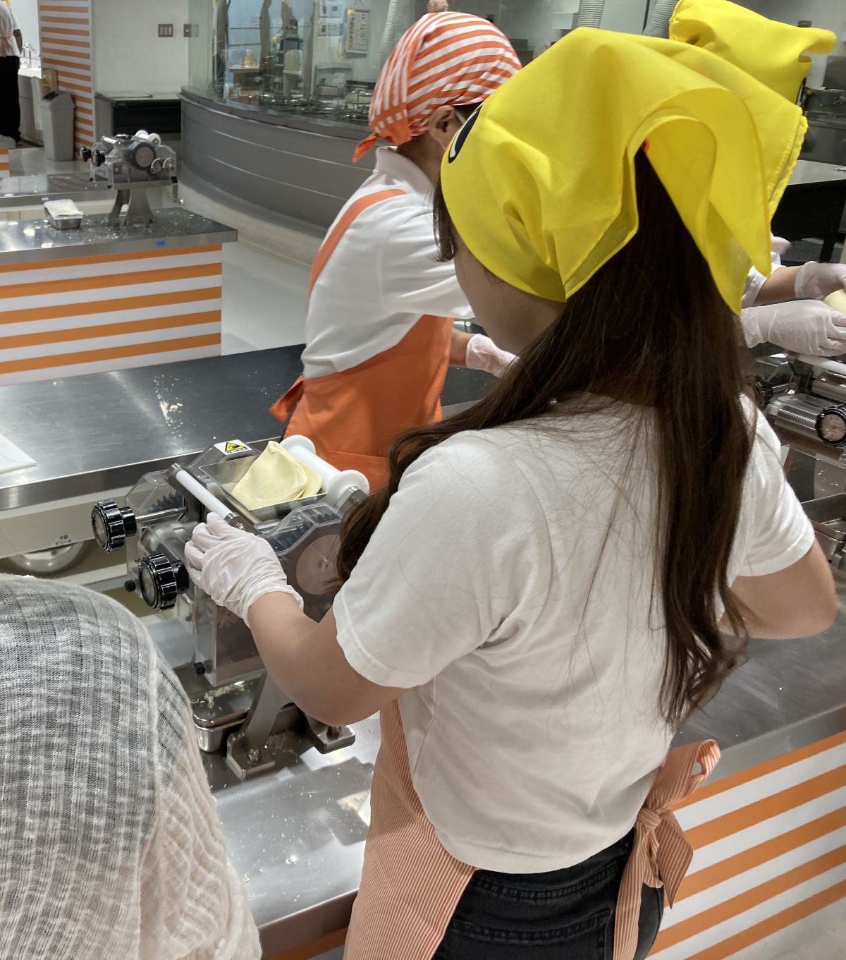 続いて体験したのはチキンラーメンの手作り体験。ひよこちゃんバンダナを身につけた生徒たちは、小麦粉をこね、のばし、蒸して味付けし、乾燥させるまでの全工程を、2人1組で協力しながら取り組みました。