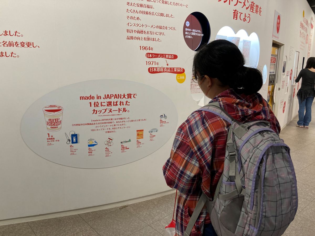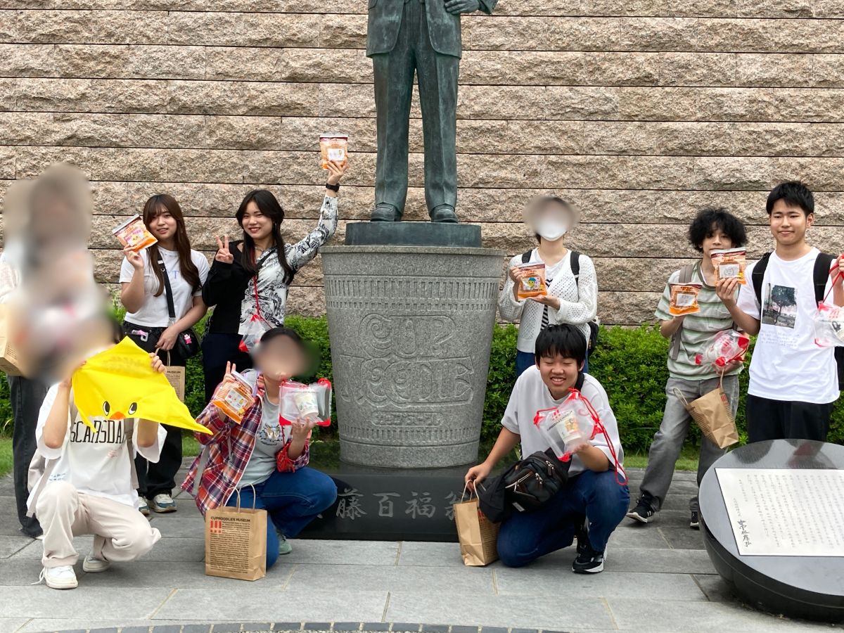 体験の合間には、インスタントラーメンの歴史展示や創業者・安藤百福さんの足跡についても学びました。普段は何気なく食べている食品が、どのような想いや工夫から生まれたのかを知ることで、食と社会の関わりについても考える時間となりました。