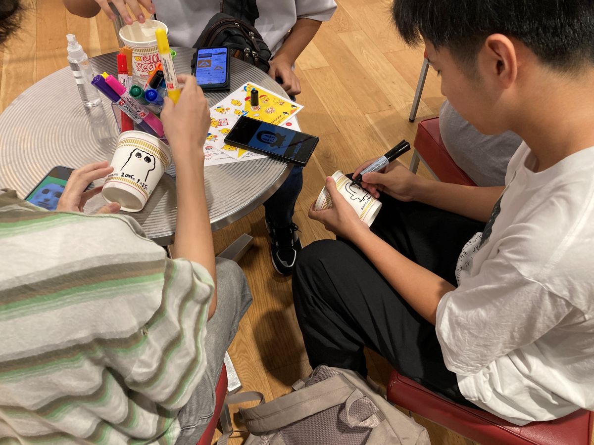 最初のプログラムは、世界に一つだけのオリジナルカップヌードルづくり。カップに自由にイラストを描いたり色を塗ったりした後、4種類のスープと12種類の具材から自分好みの組み合わせを選びます。なんとその組み合わせは5460通り!