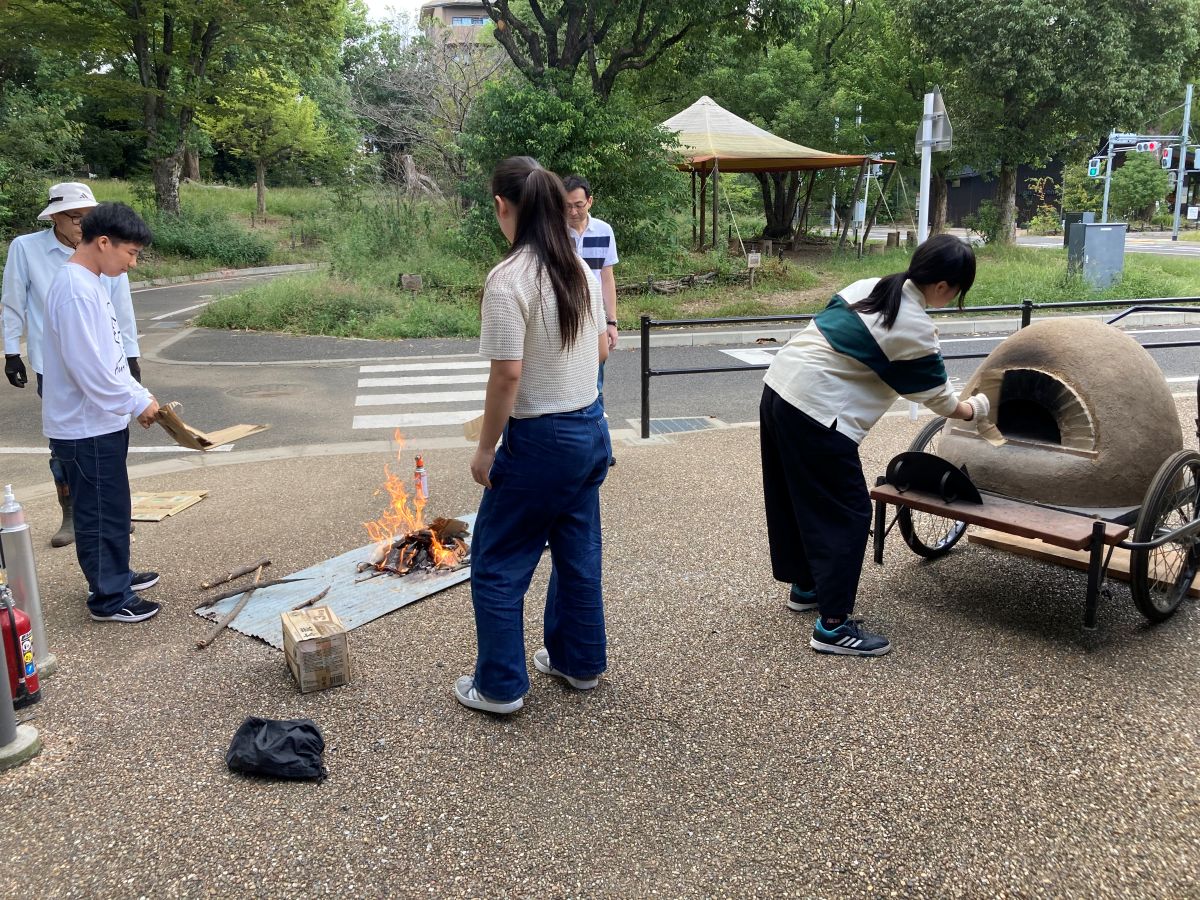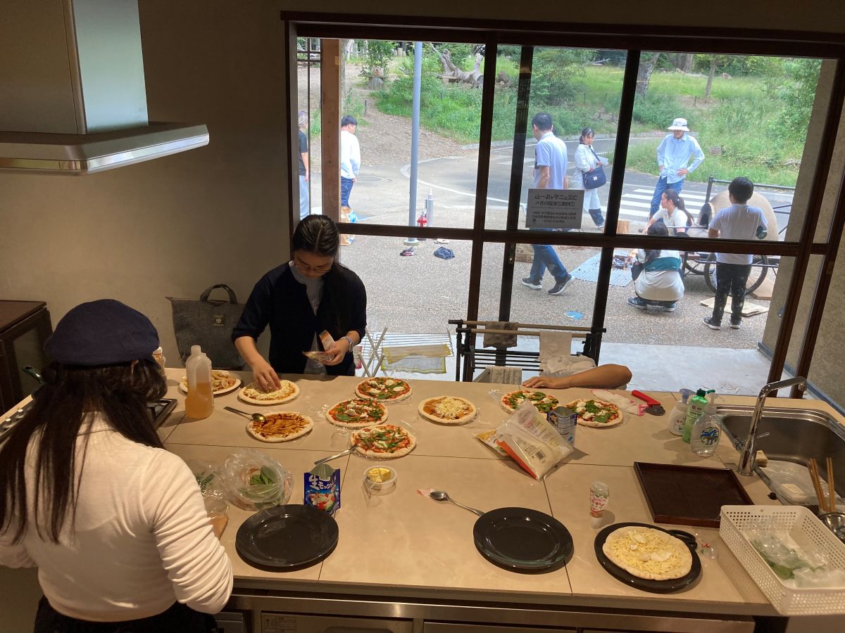 また、地域の方のご厚意で、地元の新鮮な野菜を差し入れていただき、みんなでピザづくりにも挑戦!食材を切る、トッピングする、焼き加減を見る…と、協力しながら手作りのピザを完成させました。ピザづくりで出た生ごみを処理し循環させる「コンポスト」についても、飛び入り参加した地元の子どもたちとも一緒に学びました。