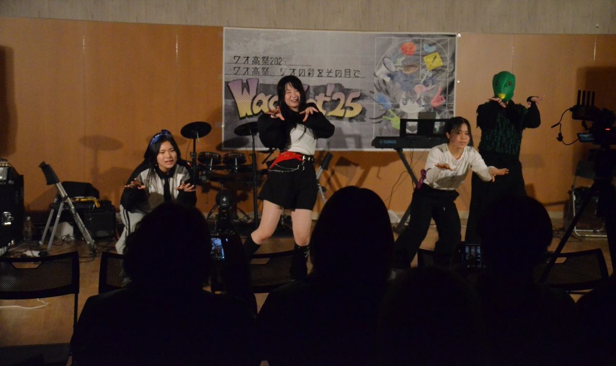 本校体育館では朝から夕方までステージ発表が続き、特に軽音楽同好会のライブ演奏には多くの生徒が集まり盛り上がりました。有志の生徒4人によるダンス発表もありました。日ごろは遠隔地に住む生徒たちなので、実際にダンスを合わせたのは当日のみという驚き!熱のこもったパフォーマンスに、観客から大きな拍手が送られていました。