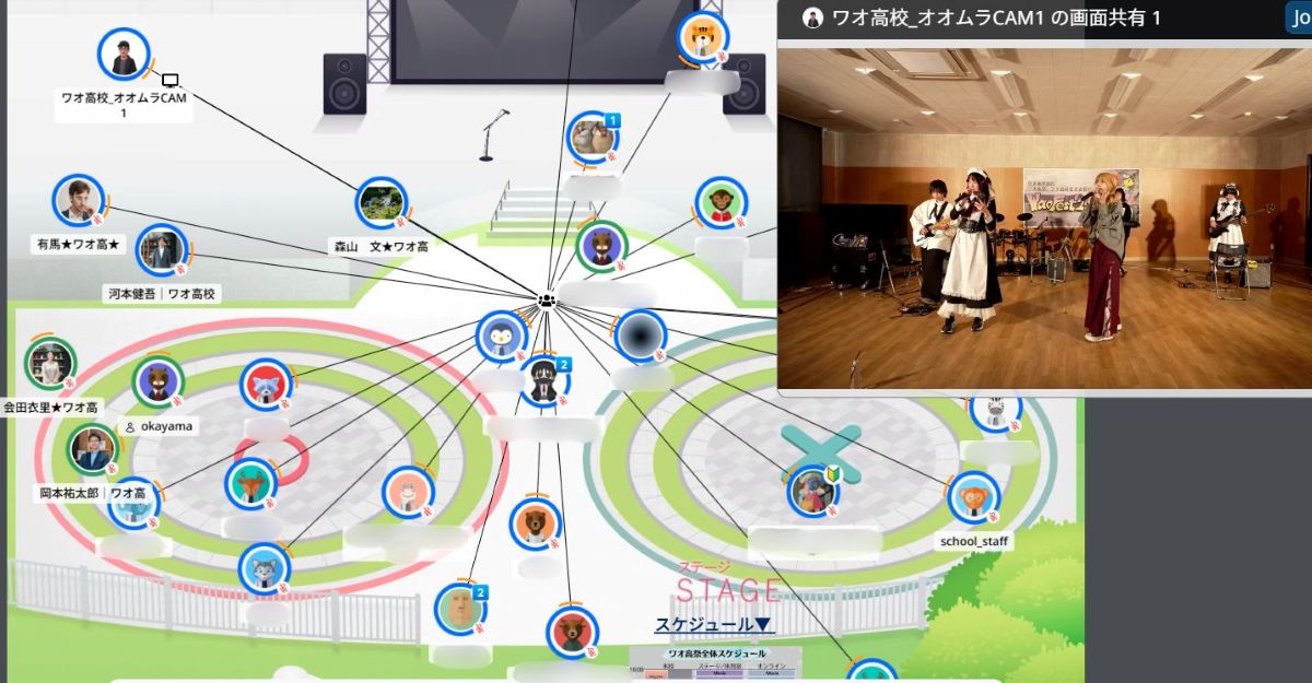 岡山本校には、全国の在校生だけでなく、在校生の保護者や高校探し中の中学生、さらにはワオ高校の卒業生も多く来校。バーチャルキャンパスでは、岡山本校のステージ発表がリアルタイムで生配信されただけでなく、オンラインならではの独自展示もオープン。PC越しでも文化祭の熱気が伝わる構成となりました。
