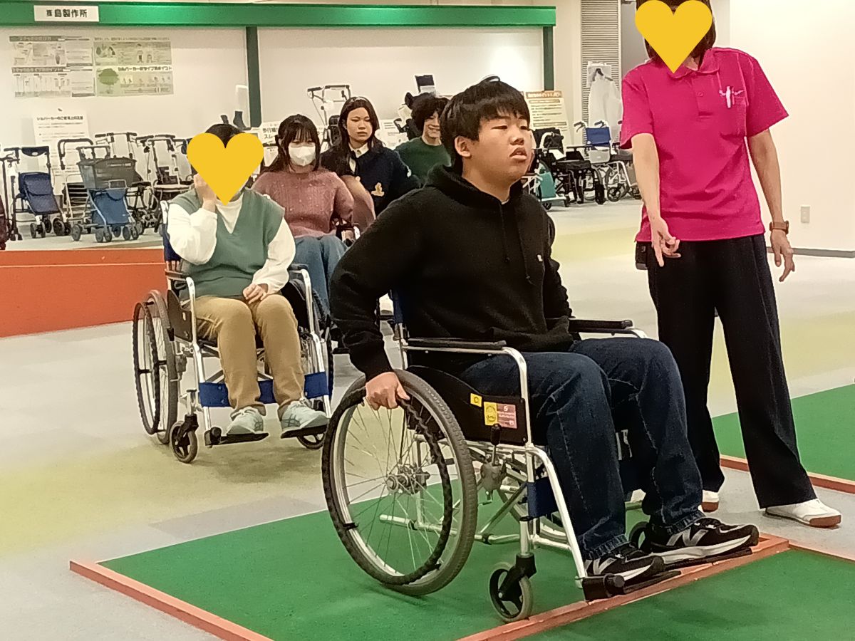「たった2cmの段差」が車いすにとっては大きな壁になることを、実際に体験して実感する場面もありました。また、電動車いす体験や、足首・ふくらはぎを固定する装具を使って階段を移動し、高齢者が感じる“日常の大変さ”を自分の身体で学びました。