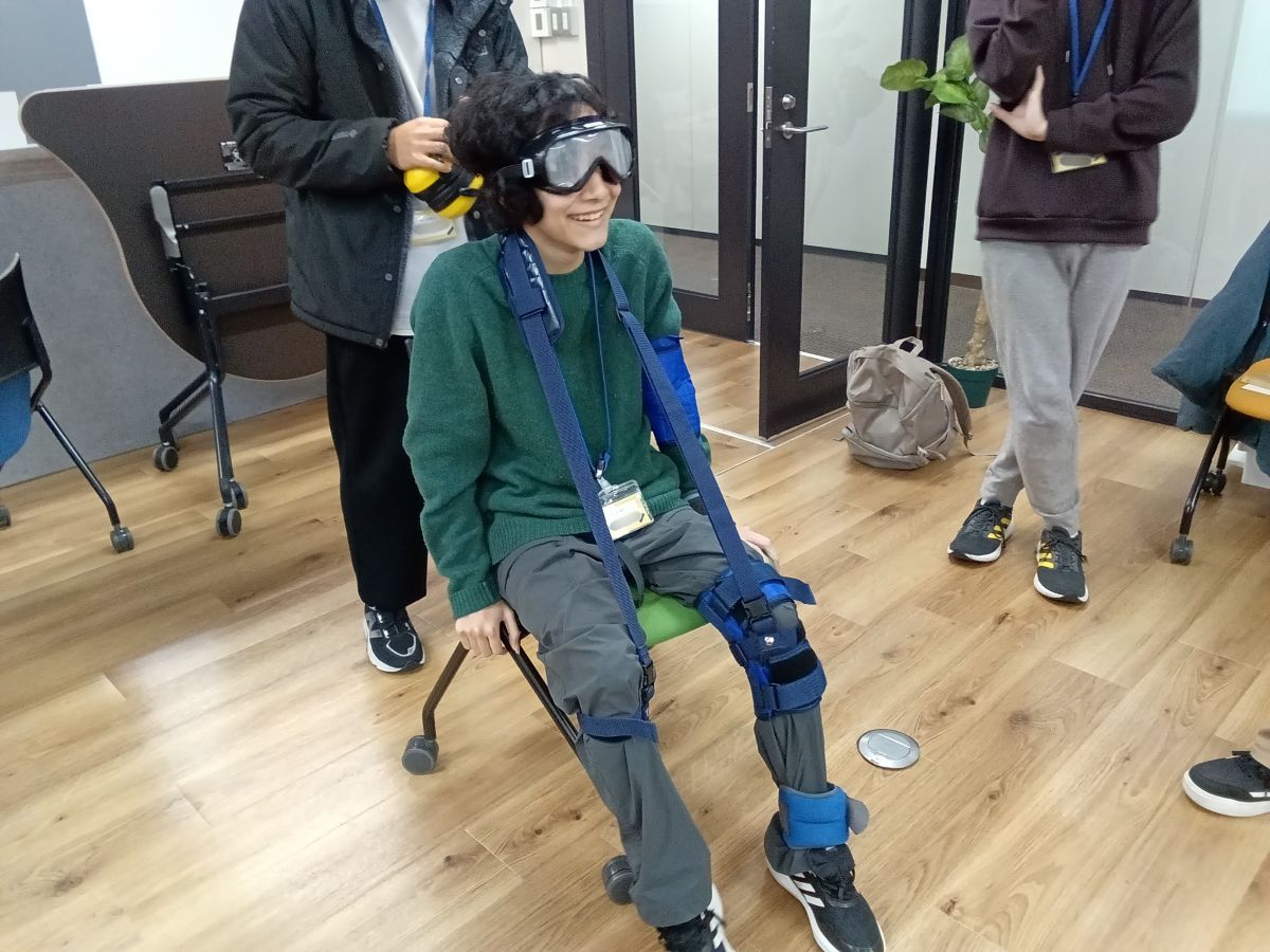 関節の可動域を制限する器具や、視界が狭まるゴーグルなどを装着し、本棚から本を取る、階段の昇り降りをする、エレベーターに乗るなど、普段なら何気なくできる動作に挑戦しました。