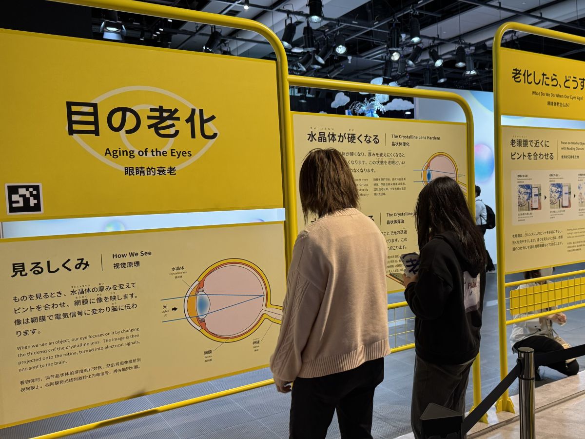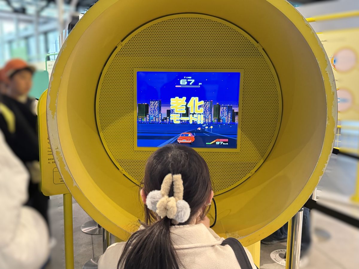 日本科学未来館の「老いパーク」という展示エリアでは、高齢者の状況を疑似体験できるミニゲームに挑戦しました。 中でも、高齢になると言葉が聞き取りづらくなる状態の体験として、「サトウ・カトウ・アトウ」の言葉を聞こえにくい状態で聞き分けるワークを行いました。 生徒たちは集中して耳を澄ませていましたが、思った以上に難しかったようです。