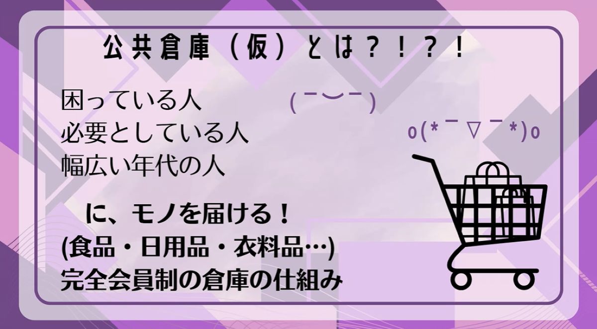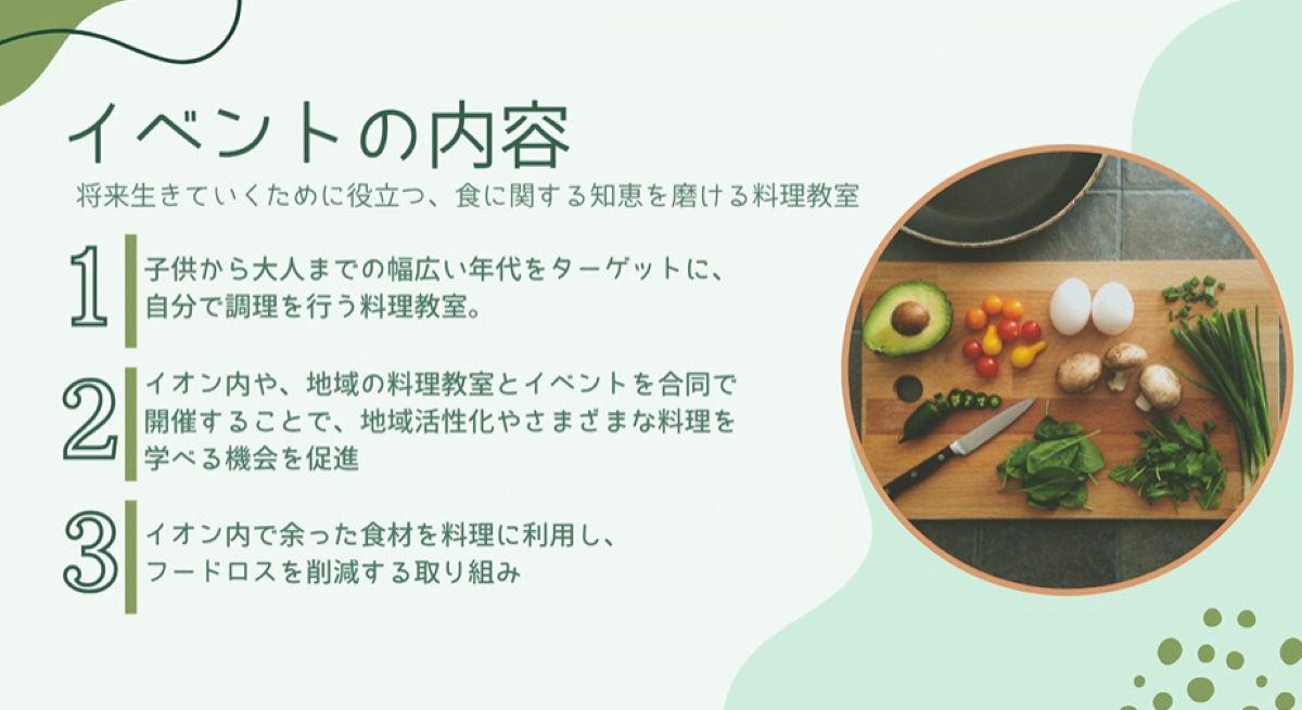 大手スーパーマーケットへの提案では、貧困問題の解決につながる「公共倉庫事業」や、フードロス削減に向けた料理イベントの企画などを発表しました。
