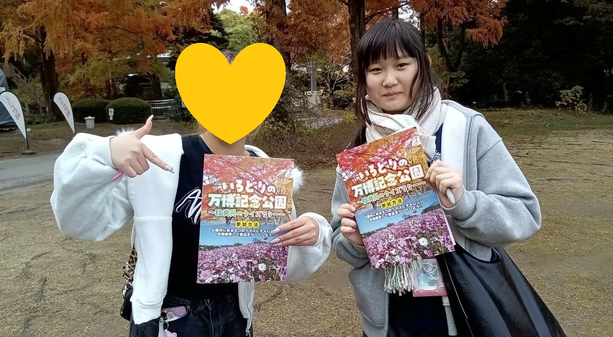雲が出ているものの気持ちの良い空気の中で活動がスタート。まずは太陽の塔をバックに記念撮影を行い、クイズラリーのスタート地点となる自然観察学習館へ向かいました。片道15分ほどかかる広大な園内を歩くだけでも、紅葉や季節の香りを存分に味わうことができました。
