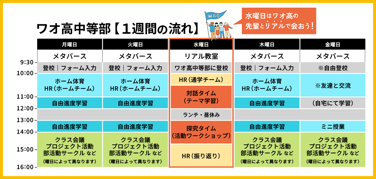 毎週水曜日、ワオ高校の先生や生徒たちと一緒に、学年の枠を超えた学びの場で、トコトン探究することで「好き」をドンドン増やしていき、新しい自分との出会いの場としてぜひご活用ください。